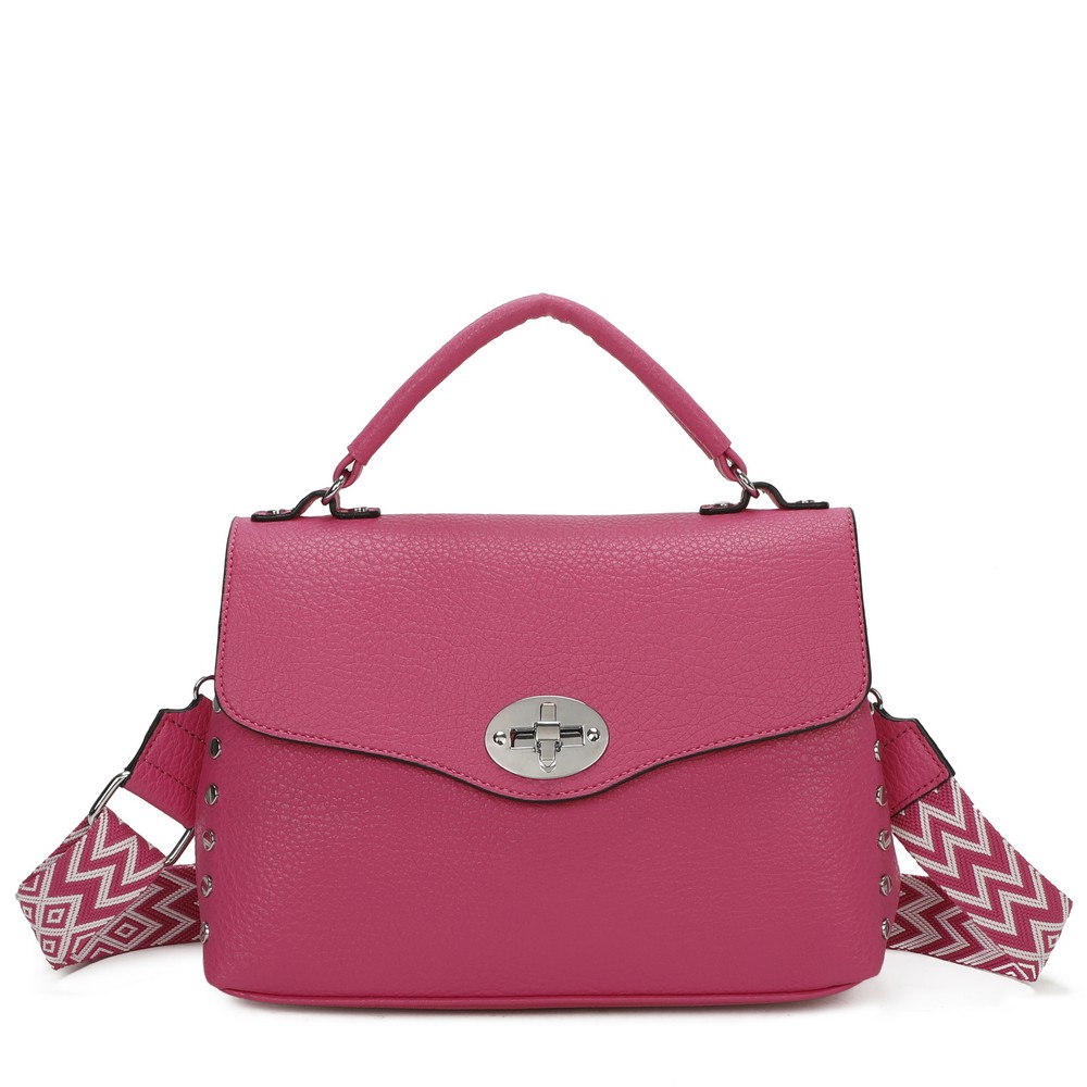 Τσάντα Δερματίνη χειρός και χιαστί με καπάκι και στριφογυριστό κούμπωμα. Διαθέτει ιμάντα που αυξομειώνεται για χιαστί και θέσεις εσωτερικά με χώρισμα και φερμουάρ και μία πίσω εξωτερικά. Διαστάσεις: Πλάτος 28 Χ Ύψος 21 Χ Πάτος 11