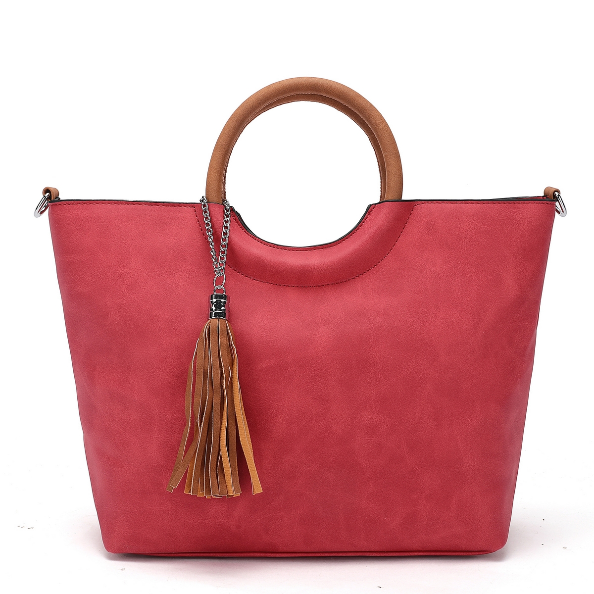 Γυναικεία Τσάντα μεγάλη με στρογγυλό χέρι και κρεμαστό φουντάκι. .Διαθέτει επιπλέον λουρί για χρήση και ως χιαστί. Διαστάσεις: Πλάτος 38 εκ. × Ύψος 27 εκ. × Πάτος 11 εκ.